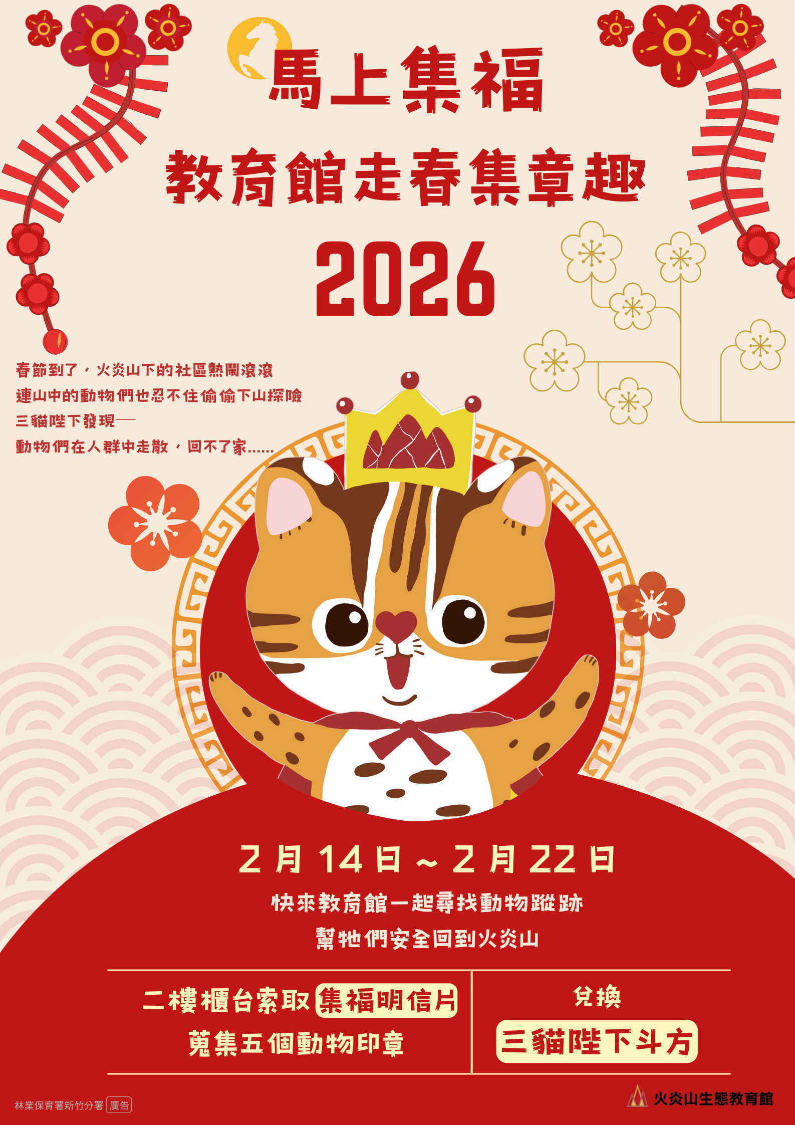 【火炎山石虎王國】教育館走春集章趣 春節接近了,火炎山下的社區中張燈結綵、熱鬧滾滾 家家戶戶忙著辦年貨、貼春聯,準備迎接新的一年 歡喜的氣氛一路傳進山林裡,讓山中的動…