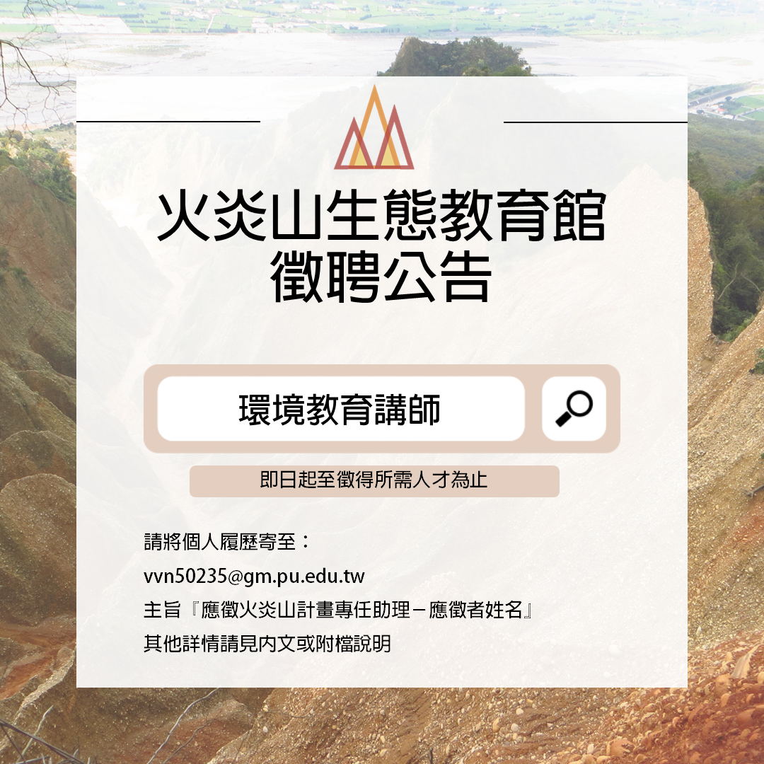 【徵聘公告】 職務類別:計劃型專任助理 工作地點:火炎山生態教育館 (苗栗縣三義鄉中正路73號) 應徵資格:學士學歷以上 (具備環境教育人員認證為佳) …